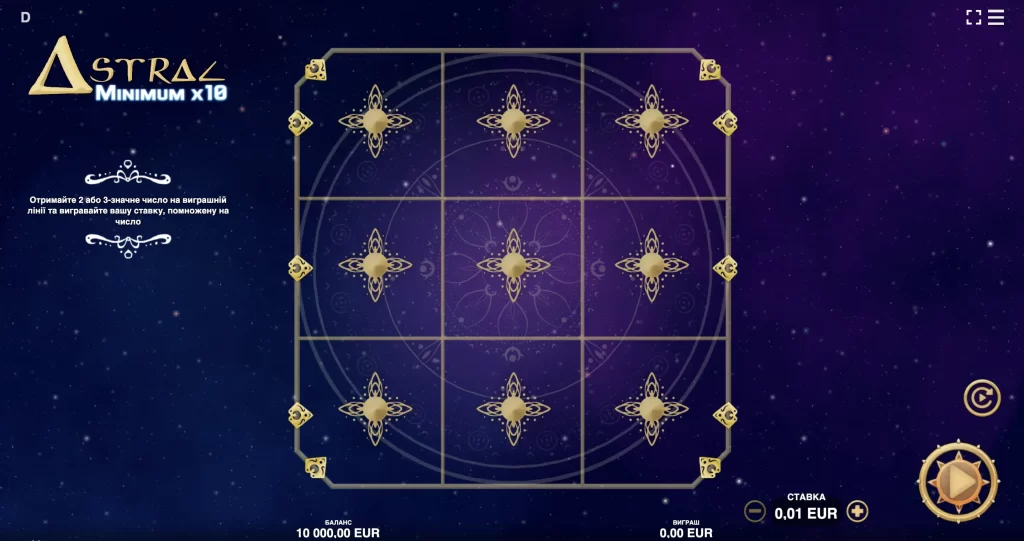 Astral – Minimum x10 переносить гравця в астрологічну тематичну атмосферу: символи, що утворюють 2- або 3-значне число на виграшній лінії, множать ставку гравця на це число. Це створює механіку “простого, але потенційно дуже вигідного” формату. Графіка мінімалістична, але зі стилістикою космосу/астрології, звук спокійний, але з елементами напруги.
